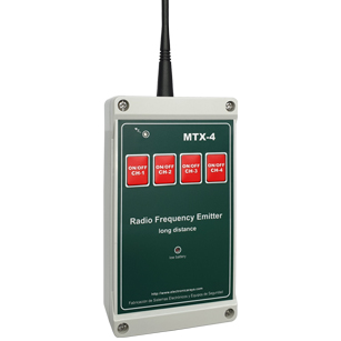 MTX-4, es un potente mando industrial para controlar a distancia cualquier dispositivo eléctrico o electrónico. El equipo controla un total de cuatro canales tipo On-Off. Cuando se pulsa cualquier botón se activa en el receptor el relé correspondiente, y cuando se vuelve a pulsar, se desactiva. El equipo incorpora en su interior una batería de 12V recargable, y un conector de entrada con tapón de goma de protección. También incorpora un interruptor pulsador On-Off, para desconectar la batería en caso de no usar el equipo. Cuando la batería llega a un nivel bajo, un led rojo queda encendido, indicando que hay que volver a cargarla. MXT-4, ha sido fabricado para cubrir largas distancias de hasta 1Km, según las especificaciones del fabricante. El receptor adecuado para funcionar con este mando, es el MRX-2/4, para 4 canales. El mando se entrega programado y con la batería cargada.